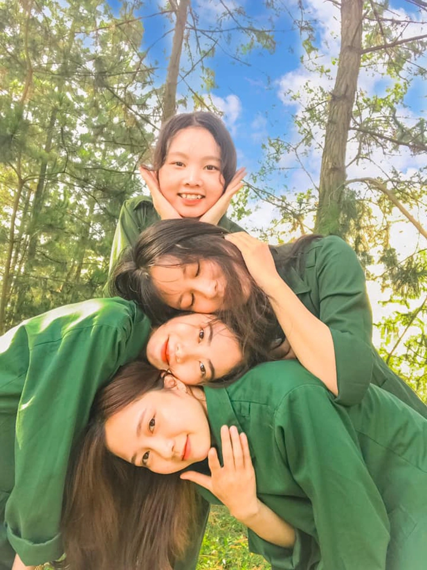 Trong ảnh, thay vì tác phong nghiêm túc cần có khi mặc quân phục, nhóm nữ sinh này lại chọn cách “biến tấu” bộ đồ màu xanh áo lính bằng tư thế không phù hợp.