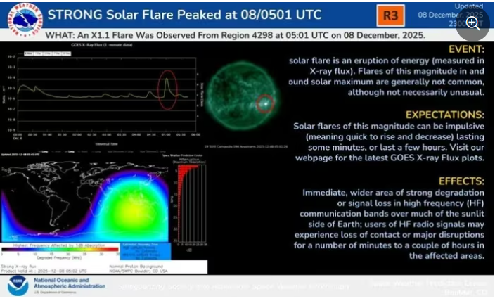 Rạng sáng 8/12 (giờ Việt Nam), Mặt trời bất ngờ phát ra vụ bùng nổ X1.1 – nhóm mạnh nhất trong thang độ flare – gây nhiễu loạn nghiêm trọng và làm gián đoạn thông tin vô tuyến tần số cao trên nửa bán cầu đang được chiếu sáng.